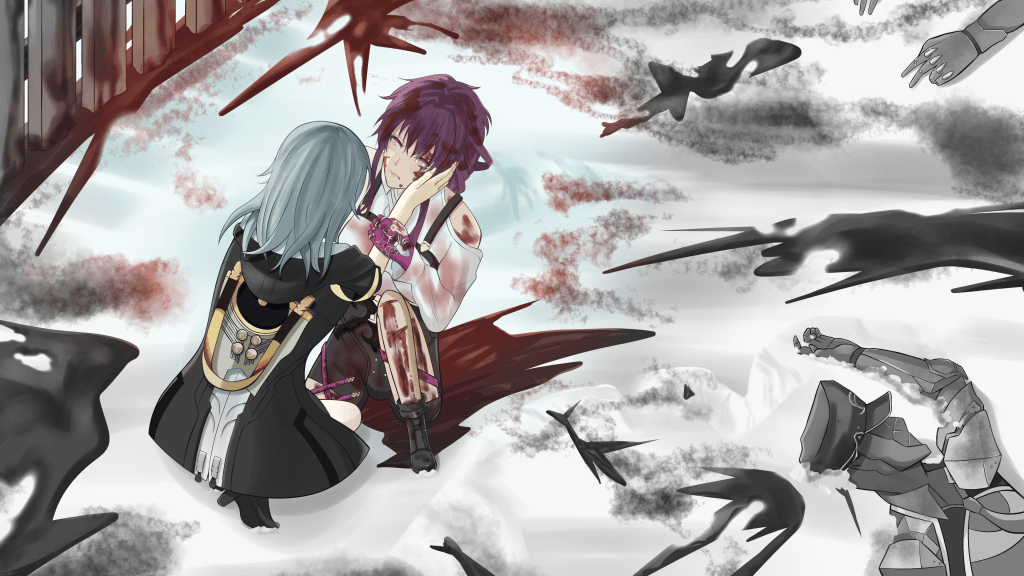 Treading upon the metal armor strewn across the ground The smell of iron and fading battle cries fill the air It's the same old monochrome painting Dyeable by neither the crimson on my sword nor body