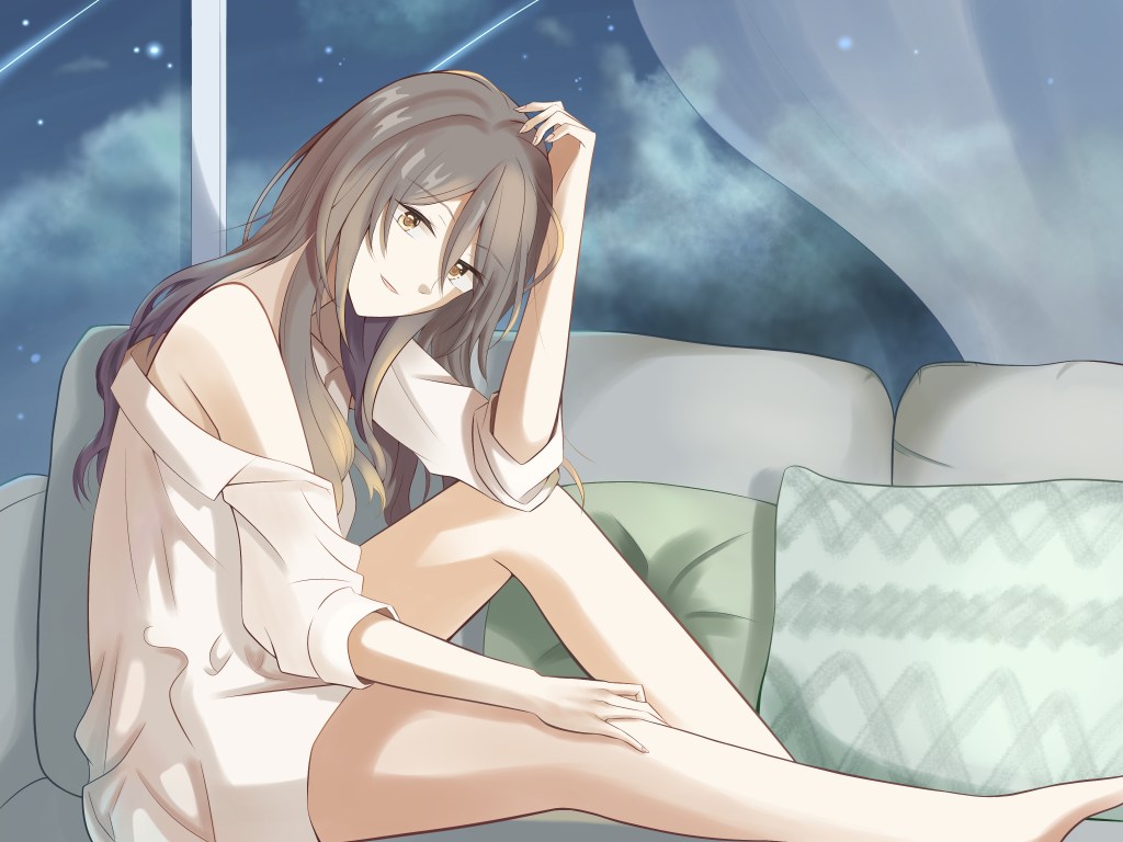 There she was, her hair reflecting orange shine from the ceiling lamp, the ends of it draping over her shoulders in gentle curves. Her blouse slid down lazily like its owner as she lounged around on the sofa, revealing more of her milky white skin against the night background.